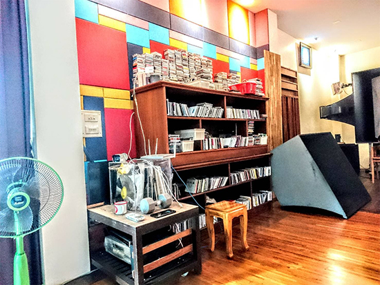 สังเกตว่า คุณ A ไม่ได้ใช้สายไฟ ที่วิริศมาหรา แพงหลุดโลกอะไรเลย คงใช้สายไฟปกติ รวมทั้งสายสัญญาณ สายลำโพงแฟนซีแพงๆ ทั้งหลาย เขาเชื่อว่า ถ้าจูนระบบลำโพงให้ดีจริงๆ สิ่งเหล่านี้ก็ไม่จำเป็น ขอให้เฟสไฟถูกเท่านั้น สังเกตว่า ชุดนี้ไม่ต้องง้อเครื่องปรับความถี่เสียง( equalizer, EQ) ดังชุดฮอร์น100%ในท้องตลาด ที่ขาดEQไม่ได้เลย คุณ A เคยทุ่มให้กับการเล่นจานเสียง เขาใช้ระดับไฮเอนด์ 3 อาร์ม 3 หัวเข็ม ( เปิดผ้าคลุมออกให้ดู) แผ่นเสียงก็มีเป็นตู้ แต่ตอนนี้เลิกบ้าจานเสียงแล้ว เบื่อการบำรุงรักษา เสียงรบกวน เล่นก็ยาก วุ่นวาย ไม่สะดวกเท่า CD เสียงจากCD ของเขาก็ไม่ด้อยกว่าจานเสียงอยู่แล้ว ถึงเวลา ฟัง กันเสียที ต้องรออุ่นชุดไม่ต่ำกว่า 30-40 นาที ไม่อย่างนั้น เสียงจะฟุ้ง ตีรวนกัน ทุ้มเบลอสั่นค้าง เวทีตื้นความเป็น3 D ไม่ชัดเจน